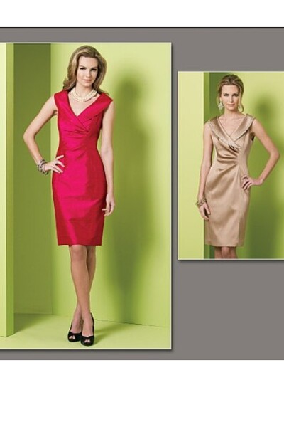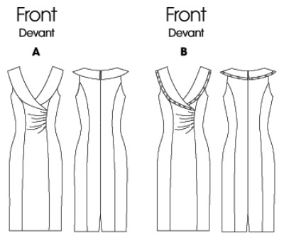 Fitted, above mid-knee, lined, sleeveless dresses A, B with princess seams, front pleats, large collar, back slit opening and invisible zipper closing. B: purchased trim.