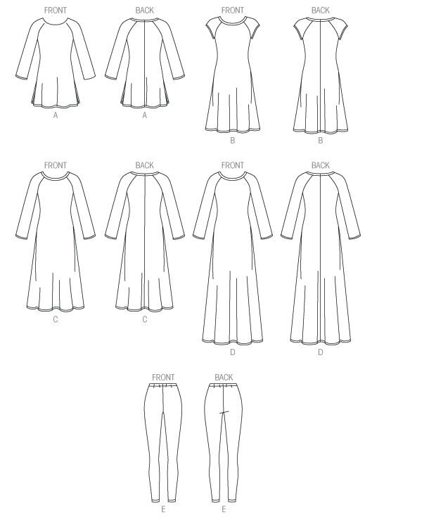 MISSES' TUNIC, DRESSES AND LEGGINGS: Pullover tunic and dresses (close-fitting through bust) have neck band and narrow hem. A: Side slits. D: Back slit. Close-fitting leggings have elasticized waist, no side seams, and stitched hem.