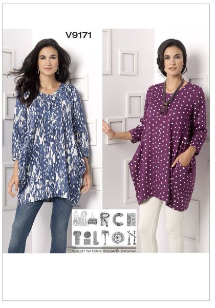 MISSES' TUNIC: Loose-fitting, pullover tunic has bias neck and sleeve binding, forward shoulder seams, side-back seams, pockets, shaped hemline, and no shoulder or lower side seams.