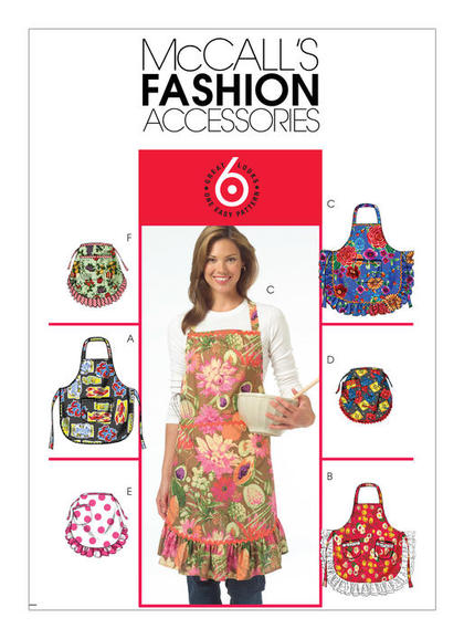 Aprons have round hem, waist tie and patch pocket variations. A, B, C: Bib apron. D, E, F: Half apron. B: Eyelet trim. C, D: Rickrack trim. E, F: Contrast waistband, tie ends, pocket band, and ruffle