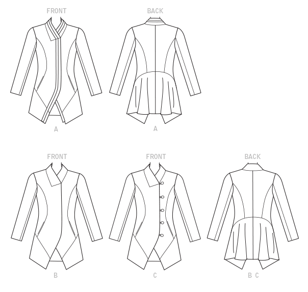 Lined jacket (fitted through the bust) has princess seams with in-seam pockets, stand-up collar, seam details, asymmetrical closing, shaped hemline and two-piece sleeves. A: Trim. A, B: Snap closing. C: Button and cord loop closing.