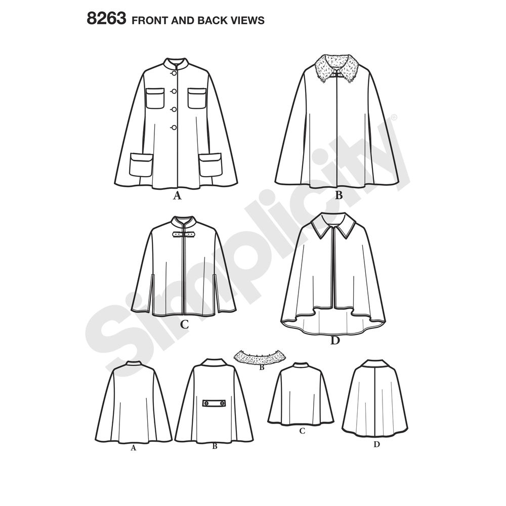 Get four great cape styles in one pattern! Cape has four pockets, button front with stand up collar or detachable fur collar with closure at neckline. Capelets have 2 collar options and View B has high-low hemline.