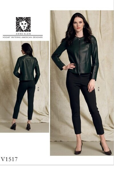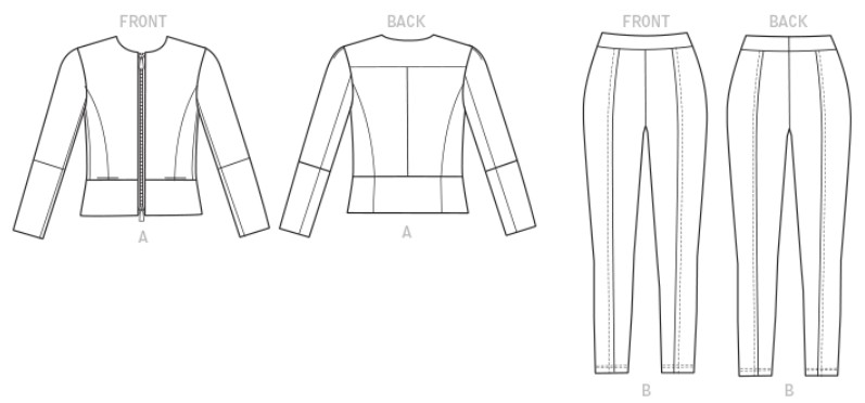 Fitted, lined jacket has side-front and side-back seams, in-seam pockets, exposed front zipper, front and back peplum, and four-piece sleeve. No provisions provided for above waist adjustment. Close-fitting pants have elasticized waistband, seam detail, and stitched hem.