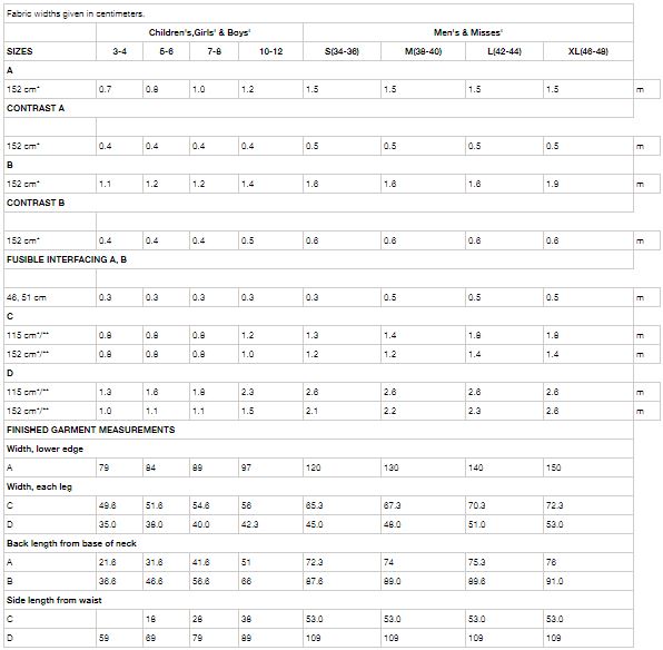 NOTIONS: A, B: Three Gripper Snaps or Pearl Snaps, 1/4 yd. (0.3 m) of 1/4" (0.6 cm) Seam Binding. C, D: 1" (2.5 cm) Elastic: 1 yd. (1 m) for Kids; 11/2 yds. (1.4 m) for Adult.