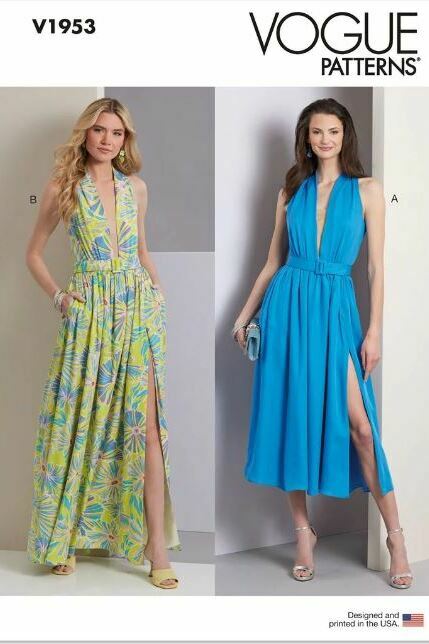 Fitted, lined dress with length variations has side front seams on skirt, thread loops, side seam pockets, invisible back zipper, left side front slit and baby hems. View A has contrast inset. Dress includes matching belt with covered buckle.