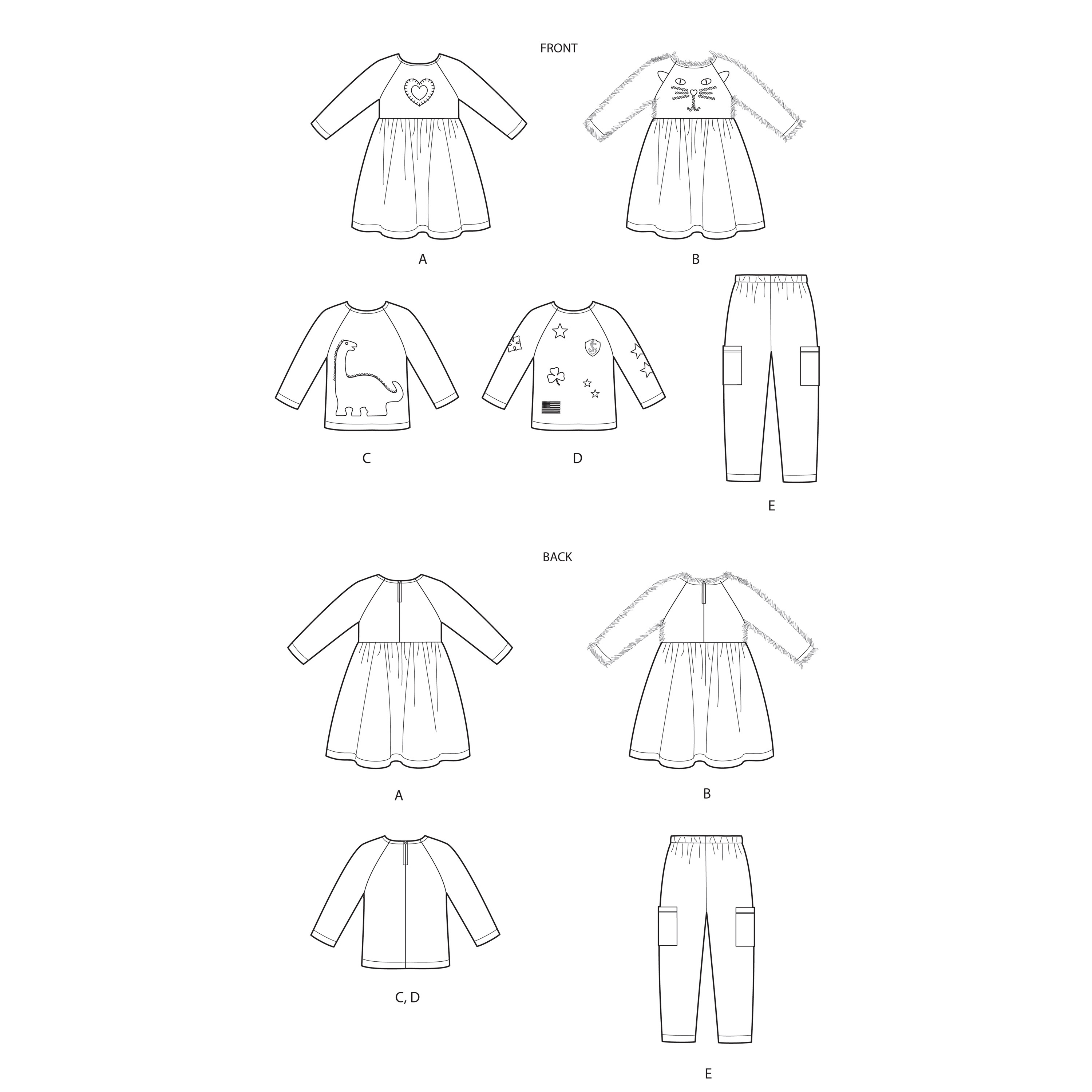 Dresses and tops are pull-on with appliqué dinosaur, shapes or cat-face with cute ears. Pants are pull-on with elastic waist and side 'cargo’ pockets. Not suitable for sleepwear.