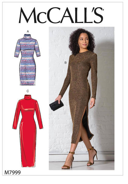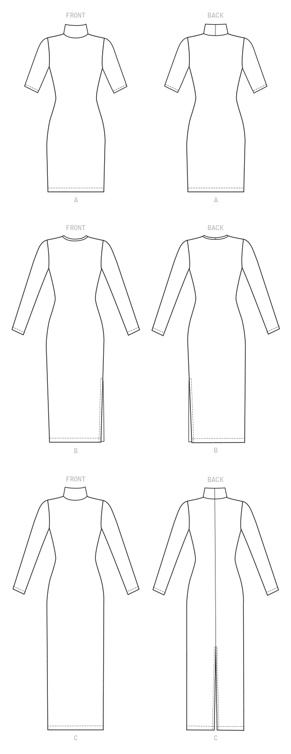 Close-fitting, pullover dresses have sleeve variations and stitched hem. A: collar. B: neck band and side slit. C: collar and back slit.