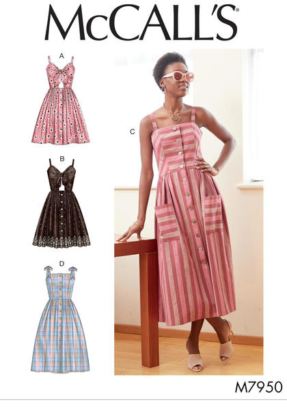 A, B, C, D dress in two lengths is close fitting through the bust, has self faced bodice, slightly flared, gathered skirt, shoulder strap and pocket variation. A, B: Bodice ties in front. A, B, D has side seam pockets. A, B: Mid-knee length. C, D: Lower Calf length. B: Scalloped border print.