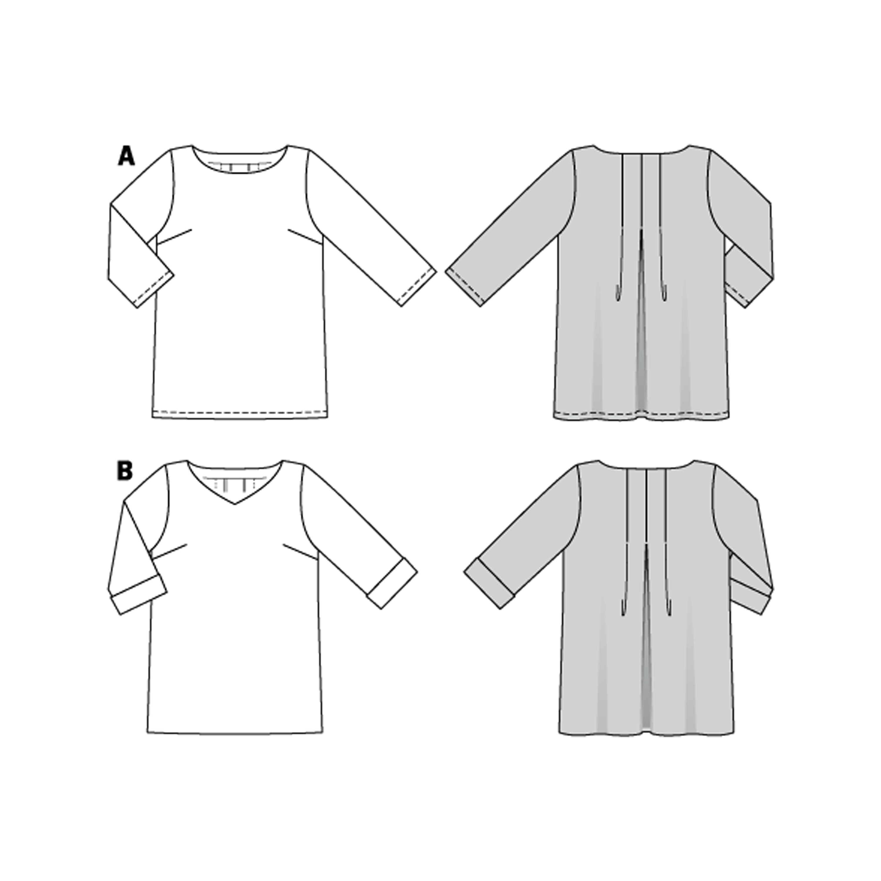 Sew the top of your choice either with a round neckline or a V-neck. The sleeve length can also be varied. This style has a sleek front but the back pleats create more of a casual fit.