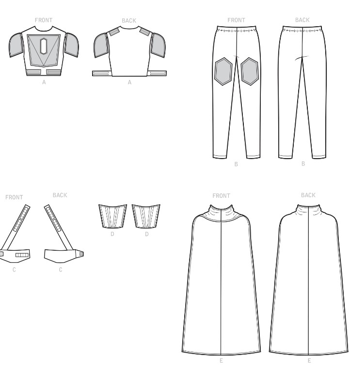 This is the way to become an unlikely hero - lined vest, easy pull on pants, belt & gauntlets get an armored look with sculpted details sewn from vinyl & faux leather fabrics. An easy cape with no-close cowl neck pulls it all together.
