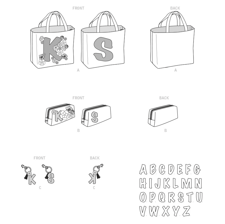 FABRICS: A, B: Canvas, Synthetic Leather, Home Dec Fabrics. Also B: Suiting, Cotton/Cotton Blends. Monograms: Cotton/Cotton Blends, Felt, Synthetic Leather, Suede. Interfacing A, B: Fusible knit. Interfacing C: Extra-Firm Craft. Lining A, B: Cotton/Cotton Blends.