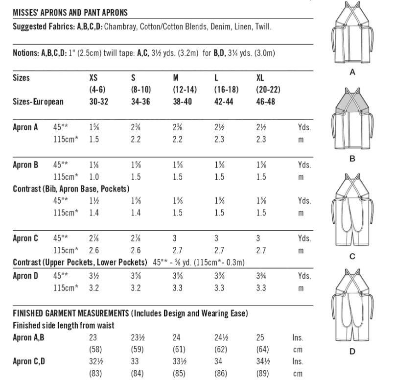 Aprons have bibs, patch pockets, twill tape ties and loops. Views A and B have slit skirts. Views C and D have pant legs.