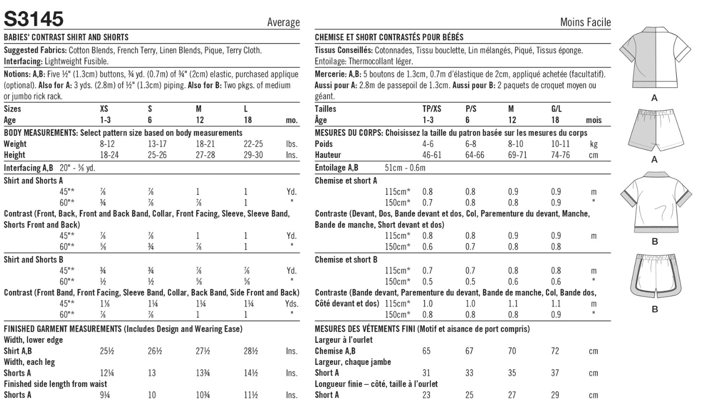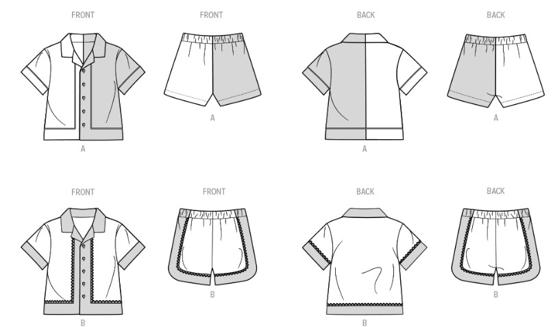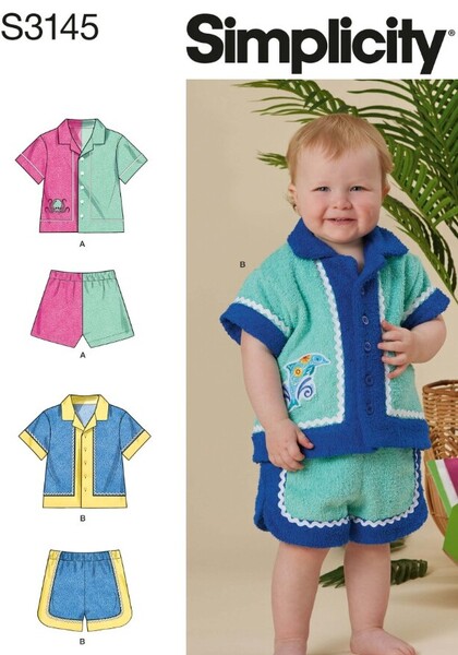 Short sleeve shirt has collar, front button opening, optional applique, purchased piping or rick rack trim. Pull on shorts have elastic waistband.