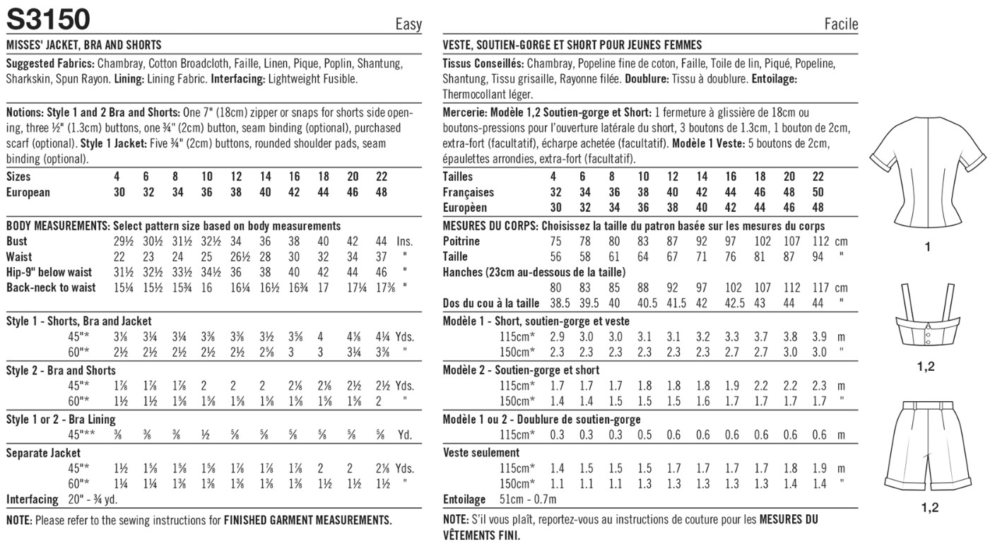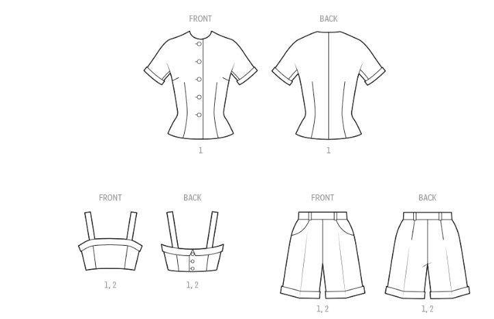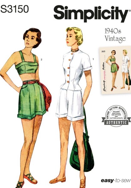 Vintage Simplicity 1940’s jacket, bra and shorts pattern. The slim shorts are fitted with darts at the back. A side closing, side entrance pockets and turn back cuffs are featured. Style 2 may have a purchased scarf slipped through the belt carriers at the waistline. The dart fitted bra buttons down the back and features wide shoulder straps. A bias fold trims the upper edge. The front buttoning jacket fitted with darts, has short, kimono sleeves trimmed with cuffs. Authentic Vintage Reproduction includes additional sizes and cutting layouts.