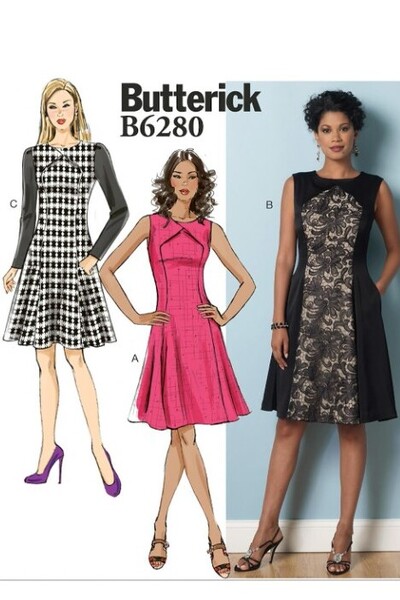 MISSES'/MISSES' PETITE DRESS: Dress (semi-fitted through bust) has princess seams, side-fronts overlapped at neckline, side pockets, and back zipper. B: Front and back overlays.