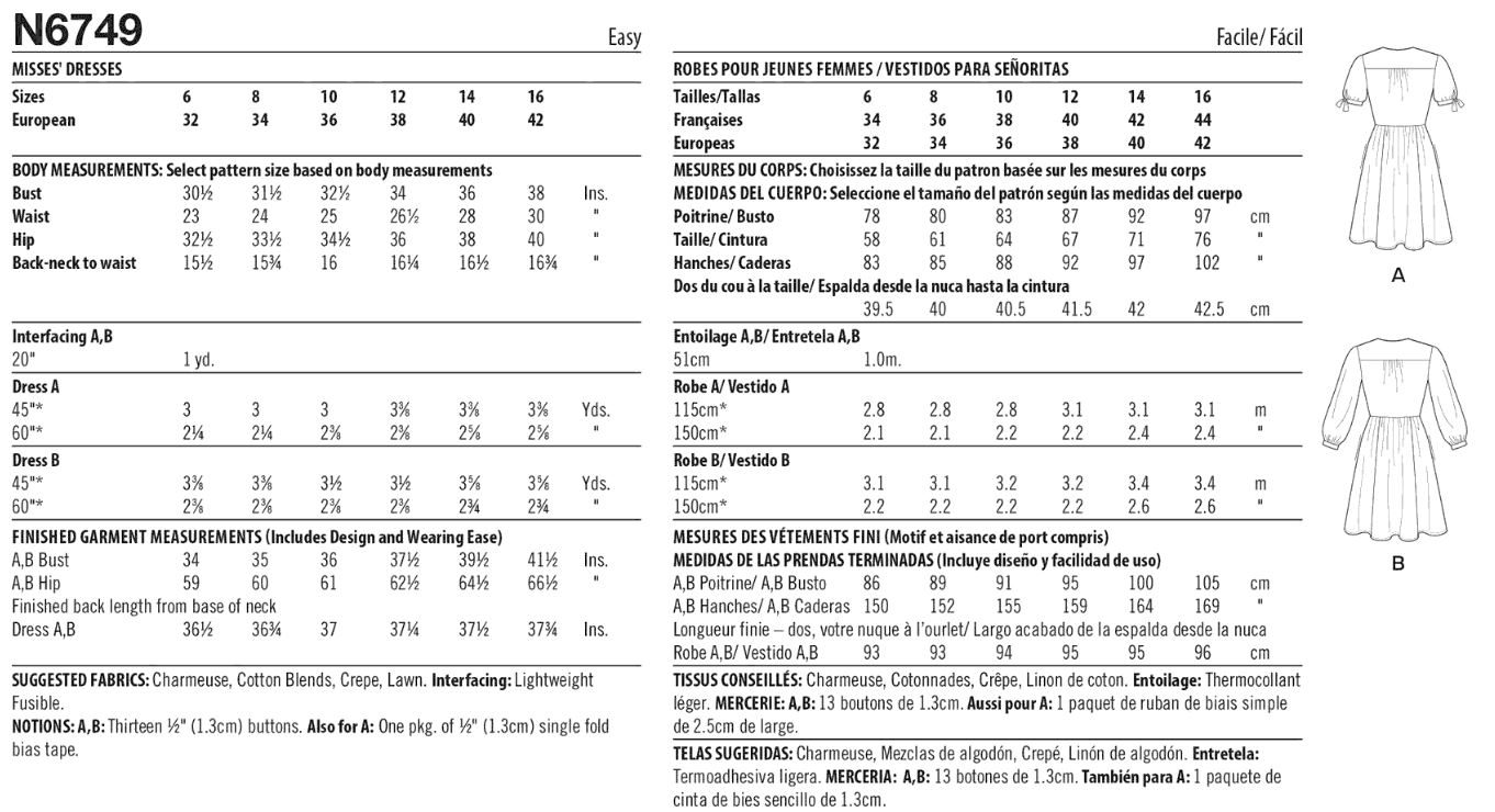 Easy to sew button front dress has short or long sleeves, fitted bodice with front midriff, back yoke and gathered skirt with side seam pockets.