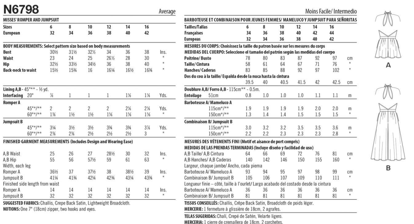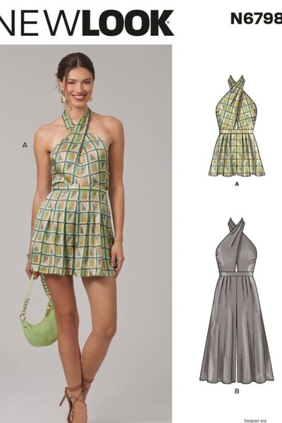 Close-fitting through the bodice romper and jumpsuit have halter neckline that ties at back of neck, back zipper, and length variations.