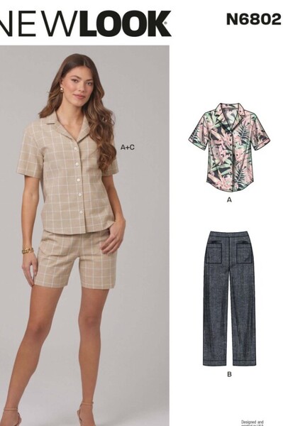 Relaxed shirt with back yoke has dropped shoulders and elbow length sleeves. Straight leg cropped trousers and shorts have patch pocket details.