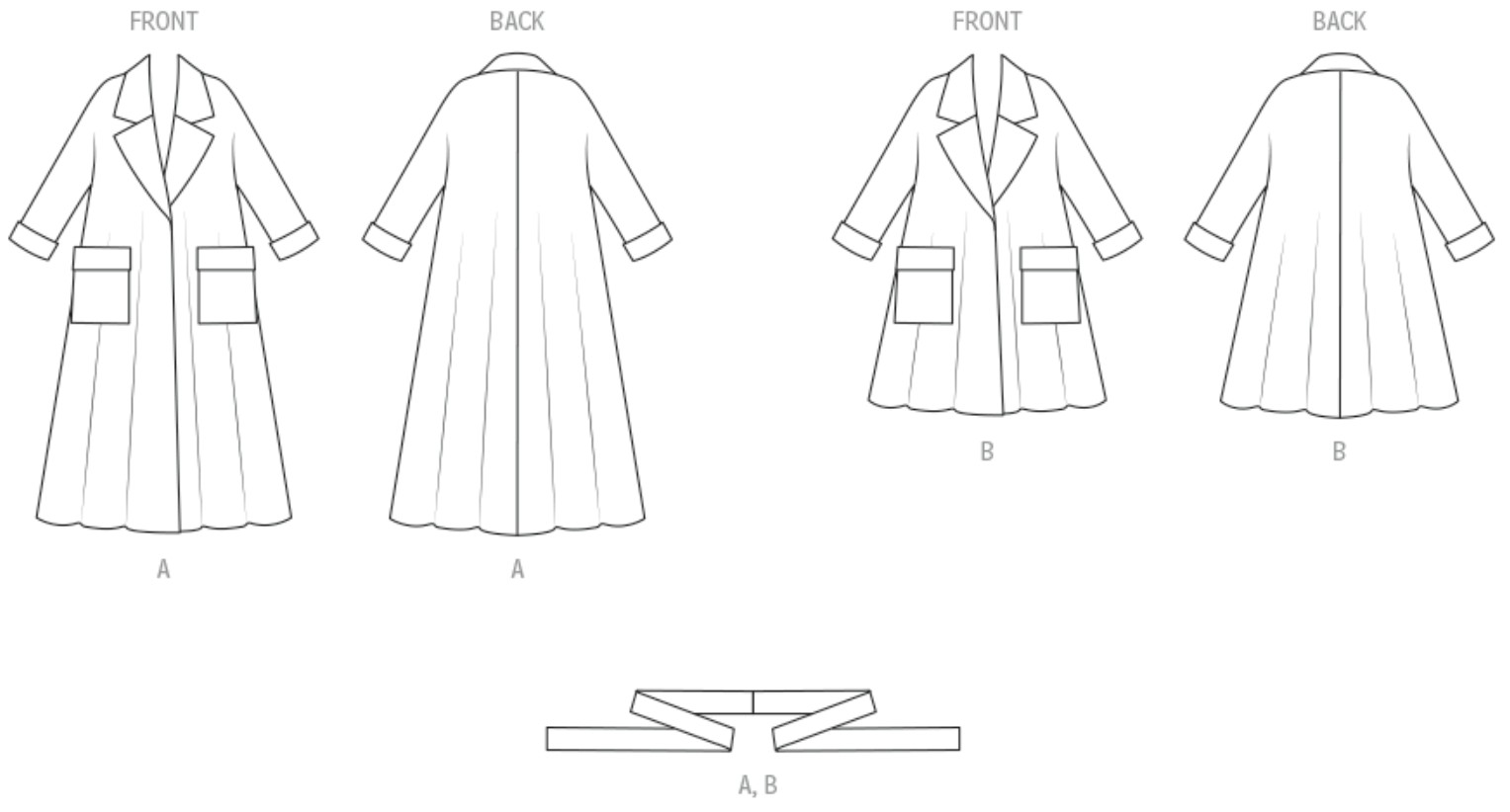 Oversized lined swing coat in ankle or knee length has long batwing sleeves with turned up cuffs, shoulder pads, patch pockets with flaps and dramatic notched collar. Coats can be worn with or without self-fabric tie belt.