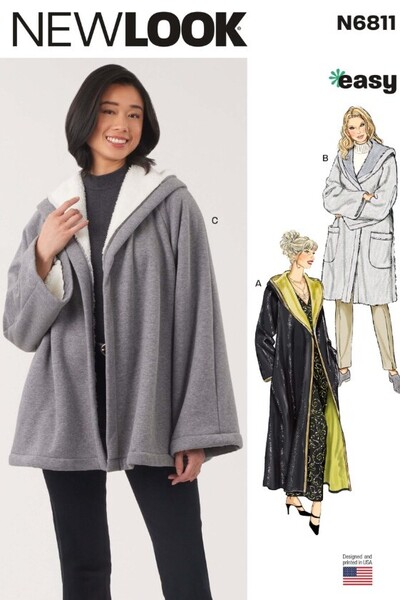 Relaxed fit hooded coat or jacket in three lengths has long raglan sleeves. View A has side seam pockets, contrast fabric lining and fold over braid trimming. Views B and C are cut of reversible fabric. View B has front patch pockets; View C has side seam pockets.