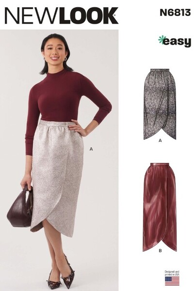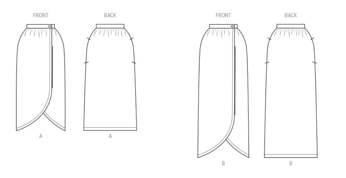 Straight wrap skirt has slim fit with front and back gently gathered into waistband and side front button closure. Both mid-calf and ankle length options have tulip hemline with top stitched narrow hem and side seam pockets.