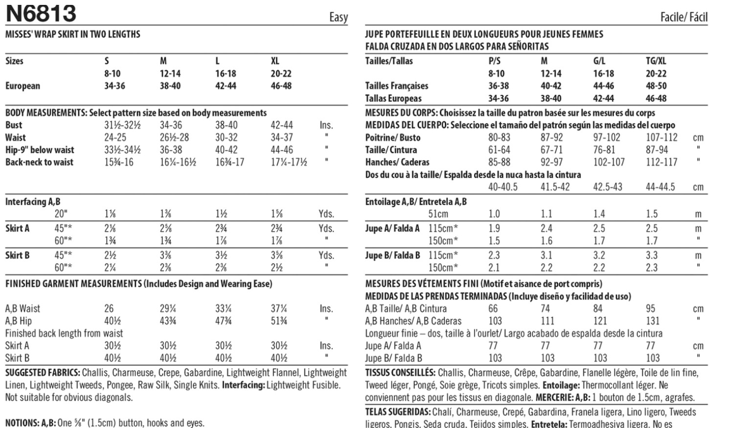 Challis, Charmeuse, Crepe, Gabardine, Lightweight Flannel, Lightweight Linen, Lightweight Tweeds, Pongee, Raw Silk, Single Knits. Interfacing: Lightweight Fusible. Not suitable for obvious diagonals.