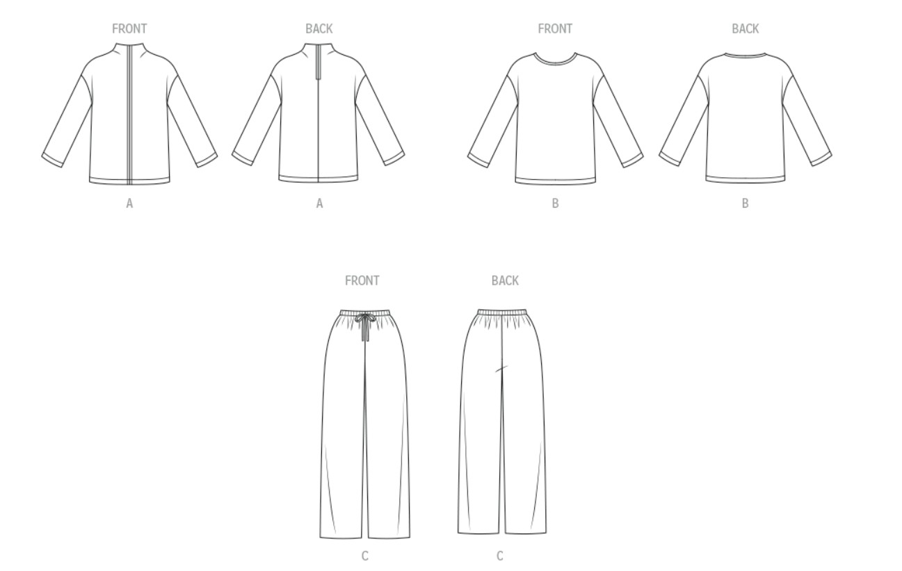 Pullover knit tops have boxy fit, dropped shoulders and long sleeves. Funnel neck top has back neck zipper, front and back seaming and top stitched details. Wide round neck top has easy turned back hems. Relaxed fit pull-on full-length trousers have applied ribbon casing for elasticised drawstring with fabric tie ends.