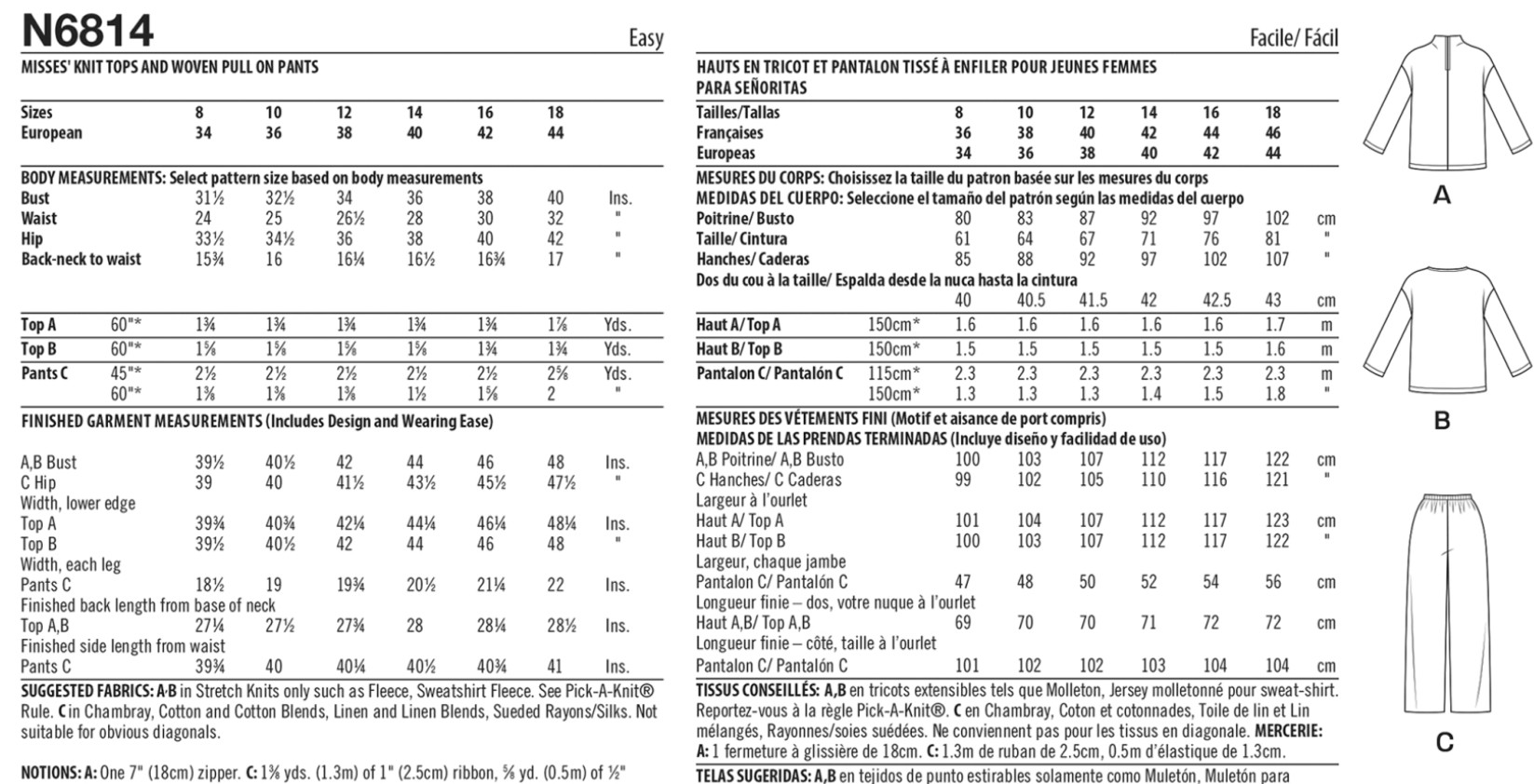 A,B in Stretch Knits only such as Fleece, Sweatshirt Fleece. See Pick-A-Knit® Rule. C in Chambray, Cotton and Cotton Blends, Linen and Linen Blends, Sueded Rayons/Silks. Not suitable for obvious diagonals.