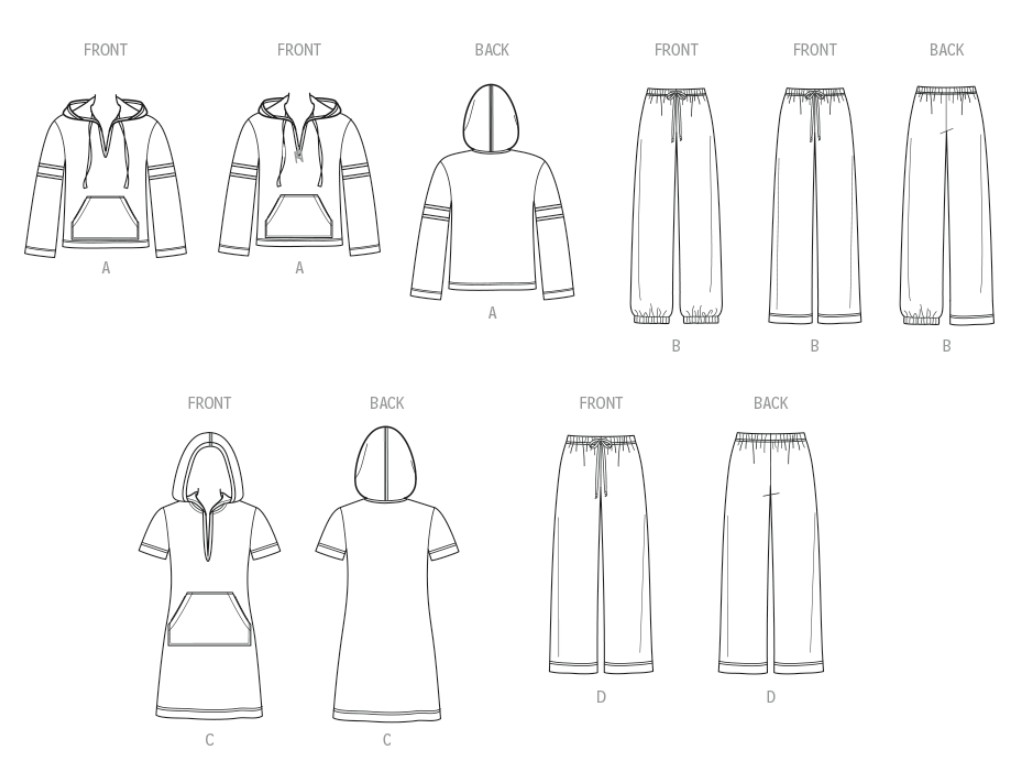 Knit hoodie has drawstring, kangaroo pocket, purchased trim, and optional appliques. Pull on trousers have elastic waistband with drawstring and hem variations. Hooded knit dress has short sleeves kangaroo pocket and purchased trim.