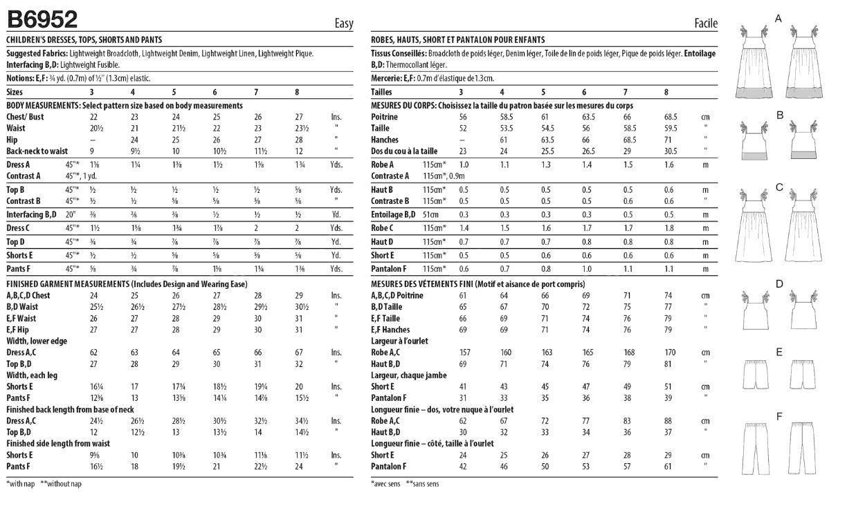 Loose-fitting, pullover dress or top. A, B: Contrast shoulder straps/bands with tie ends. A, C: A-line, below mid-knee, raised waist, self-lined bodice. Loose-fitting shorts or pants have elastic waist and narrow hem. F: Above ankle.