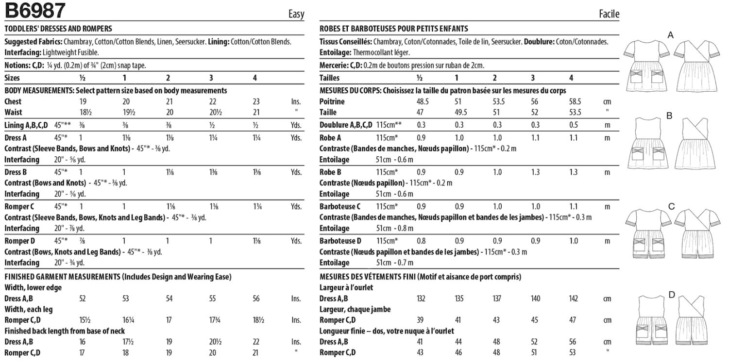 Dresses and rompers have bows on the pockets and an overlap back opening. Views C and D have a snap crotch and contrast bands at legs. Short sleeves have contrast bands.