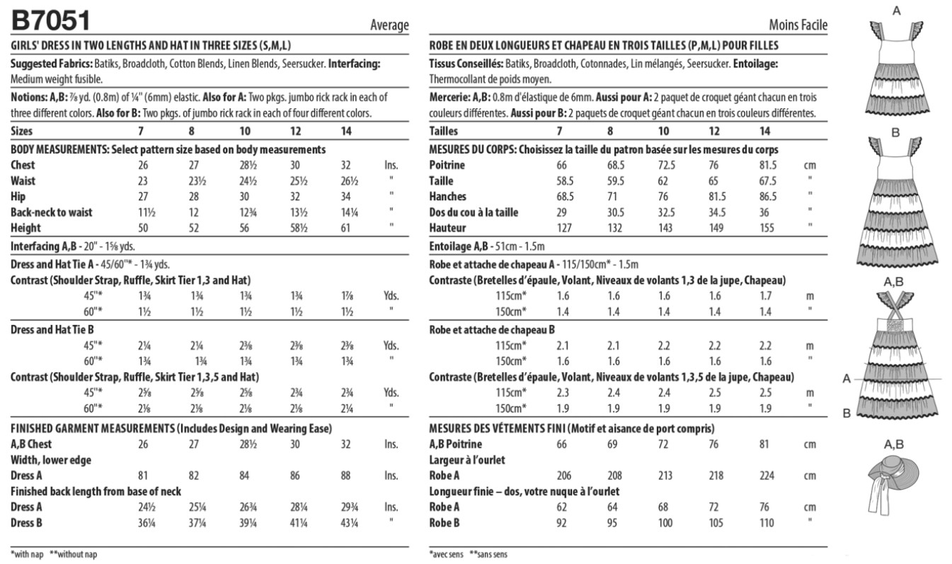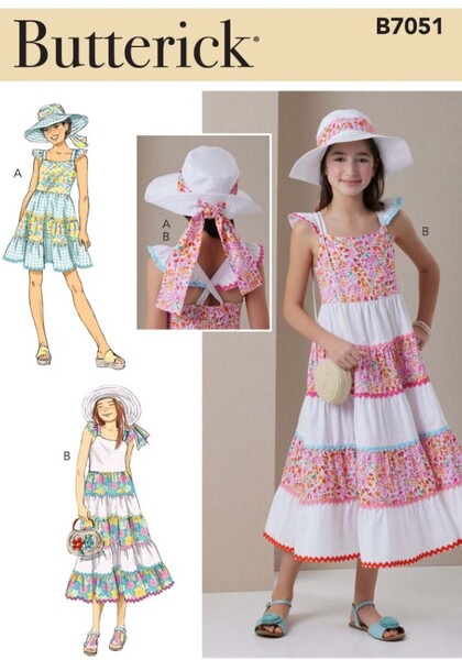 Pull-over tiered dress in two lengths has gathers, ruffle sleeves with rick rack trim, side seam pockets and crossover straps at back of dress. Hat comes in sizes S-M-L.