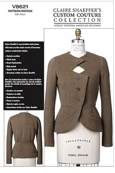Fitted, lined, partially interfaced jacket has shaped front opening edges, bound buttonholes, welt pockets, back pleats, side back seams, gussets, back kimono-shaped sleeve and front set-in sleeve. Jacket is constructed using couture sewing methods.