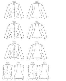 MISSES' JACKET AND VEST: Loose-fitting, unlined jacket or vest has front extending into back collar, front darts, back extending to lower side front, no side seams, and shaped hemline, wrong side may show. B: sleeves with slit, narrow hem and topstitching by hand. D: mock front band, stitched hems, back cut on crosswise grain. FABRICS: A,B,C: Moderate Stretch Knit: Ponte Knit, Knit Jacquard. D,E: Lightweight Linen, Silk Broadcloth. NOTIONS: Buttons: Two 11/8" for A,E; Three 7/8" for B; Two 1" for C; Three 11/8" for D.