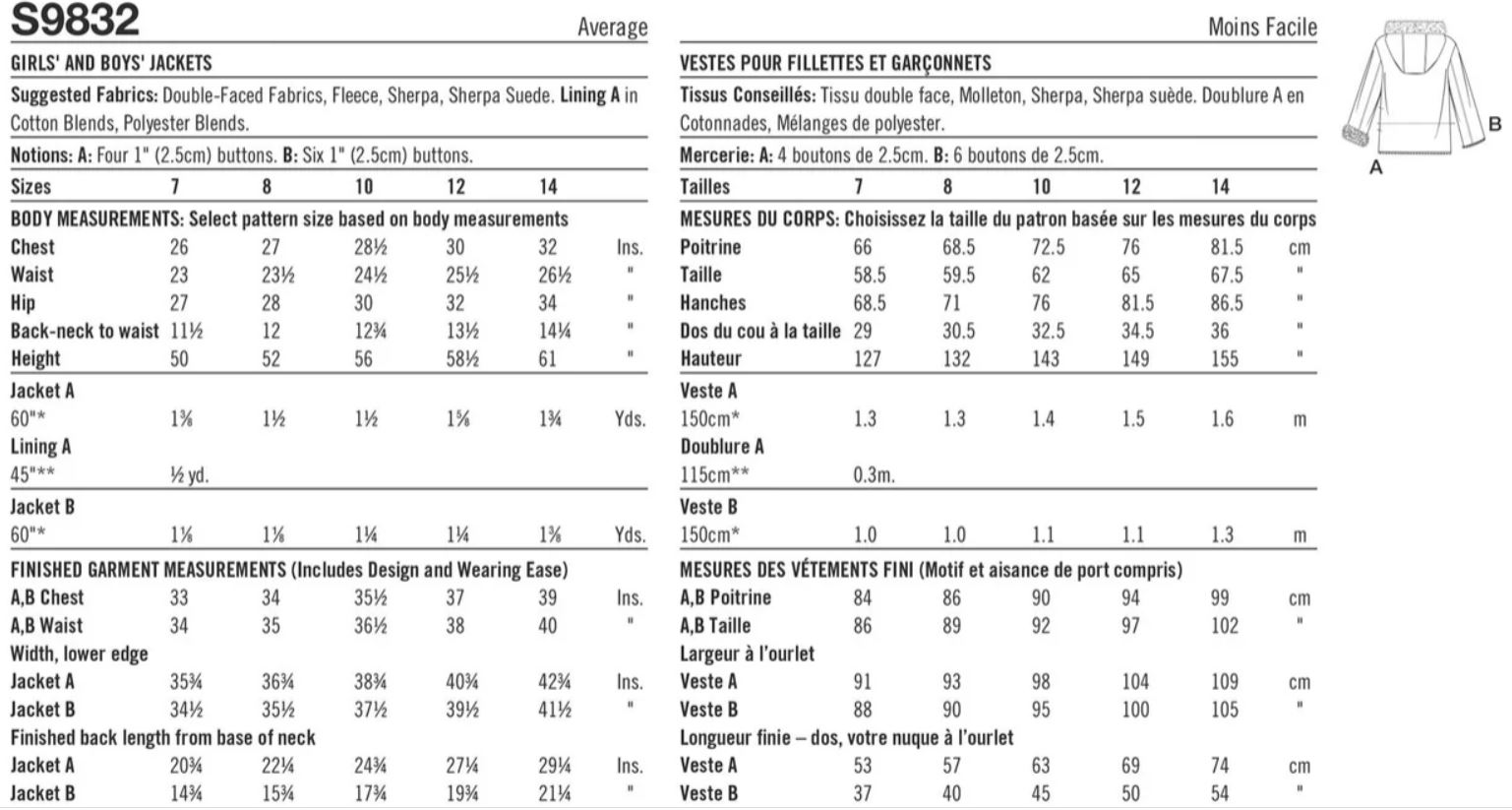 Simplicity sewing pattern for Hooded double breasted jacket in two lengths for boys and girls sized 7-14 with dropped shoulders is intended for double-faced fabrics only. View A has pockets.