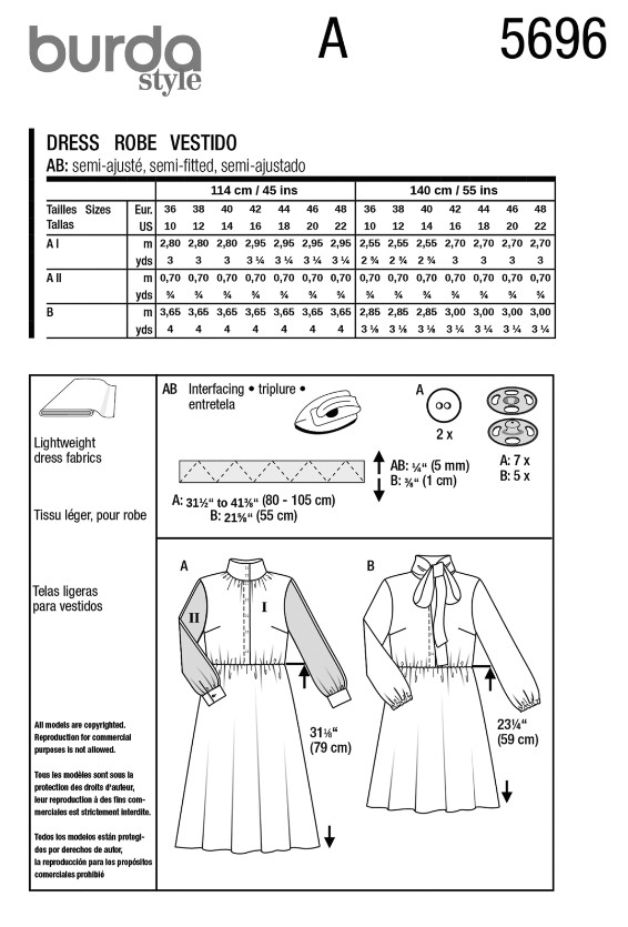 This dress pattern offers two chic variations – perfect for experienced sewers! The first pattern blends sporty and feminine elements with a stand-up collar, concealed button placket, and bell skirt, highlighted by colorful stripes and color blocking. The second pattern is versatile, featuring a flap and elasticated waist, making it ideal for dinner, the office, or a party. Dress it up with a blazer and heels, or keep it casual with ballerinas!