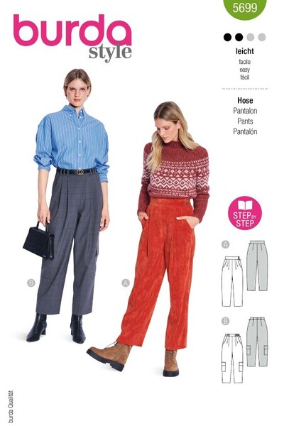 This trouser pattern offers two stylish variations, perfect for beginner sewers! Pattern 1 features vibrant corduroy in eye-catching colors, with a side button placket and wide waistband for a bold look. Pattern 2 is a refined checked cargo style, ideal for the office, with triple belt loops and optional XL pockets for a touch of flair. Both versions are easy to sew and sure to stand out!