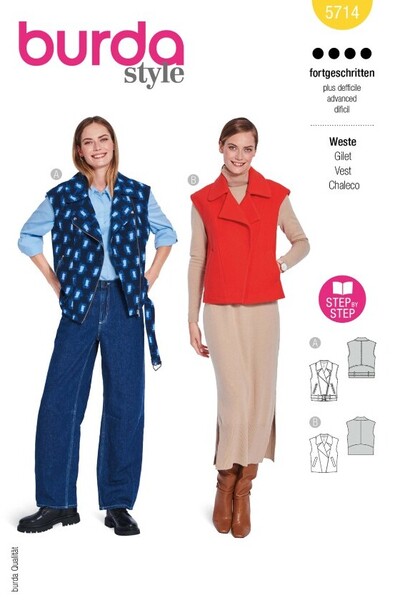 This vest pattern, ideal for advanced hobby sewers, offers two versatile variations. The first features a biker-inspired design with an asymmetrical closure, zipper pockets, and a belt—perfect for a rock look that’s also office-ready. The second combines sporty elegance with impeccable shaping and fine coat details like welt pockets and diagonal woolen fabric—truly eye-catching!
