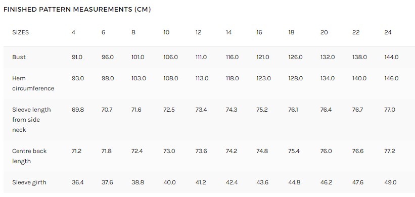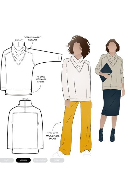 The Belmore Knit Tunic sewing pattern is a relaxed and easy to wear tunic. It features a deep V-neck with a cowl collar insert, a distinctive sleeve that extends into a saddle shoulder, and a gentle hi-low hemline that adds subtle interest to the overall design.