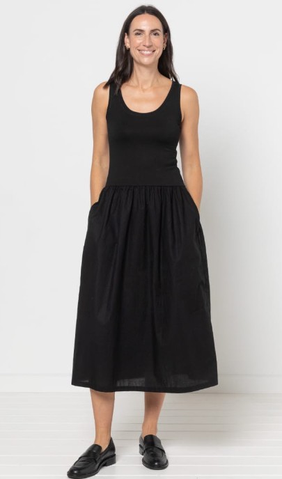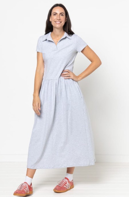 The Carter Dress sewing pattern features a knit bodice with multiple top options—including polo, tank, and tee styles—paired with a mid-calf skirt in knit or woven, optional inseam pockets, and sleeve variations for a versatile, customisable look.