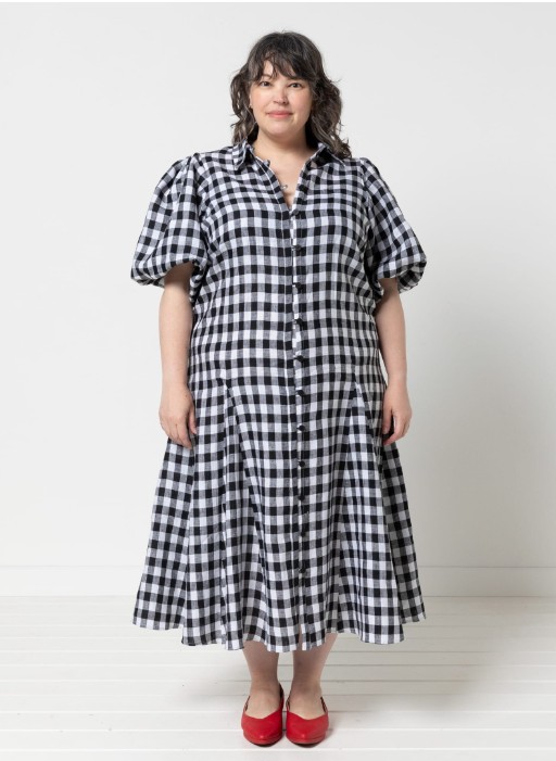 The Dallas Woven Shirt and Dress sewing pattern creates a puff sleeved button front shirt or dress, with optional godets for the dress. It features high or traditional two-piece collar options, a front placket with buttons and loops, elbow-length puff sleeves gathered into a lined elastic cuff, waist tie with belt loops and optional inseam pockets and dress godets.