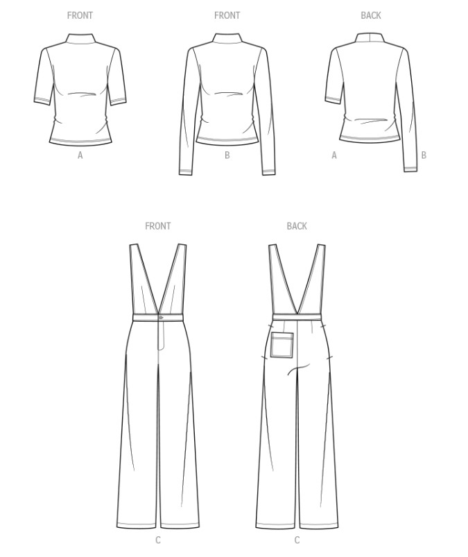 Straight leg, sleeveless jumpsuit has waist darts at bodice front and pant back, front fly zipper, side seam pockets, and optional back patch pocket. Complete the look with Views A and B, short and long sleeve turtleneck tops.