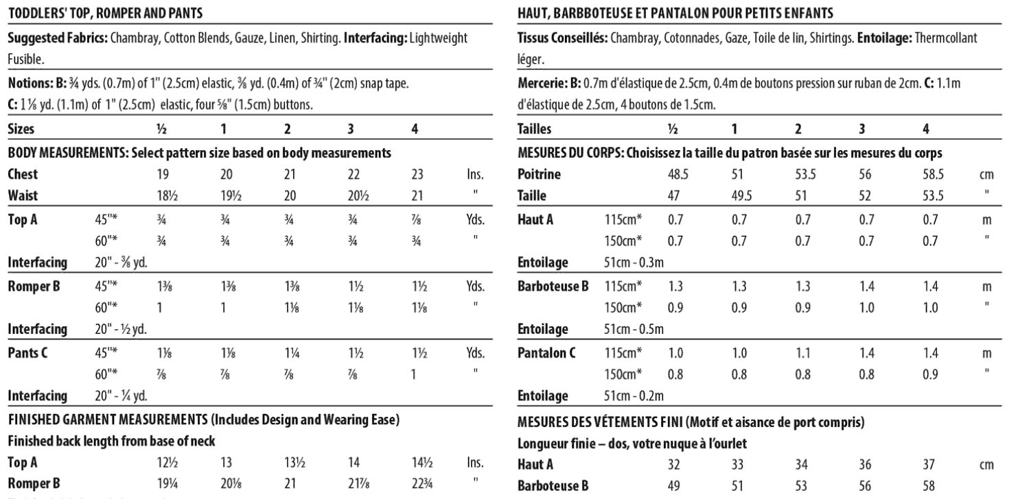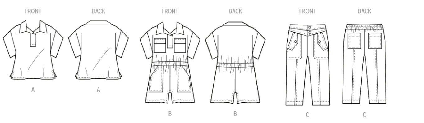 Create these stylish toddler outfits for Spring! Top and romper have short sleeves, collar and placket. Romper has elastic at waist, front pockets and purchased snap tape at the crotch. Ankle length pants have seam details, front yoke, decorative buttons at the pocket flap and elastic waistband.