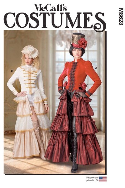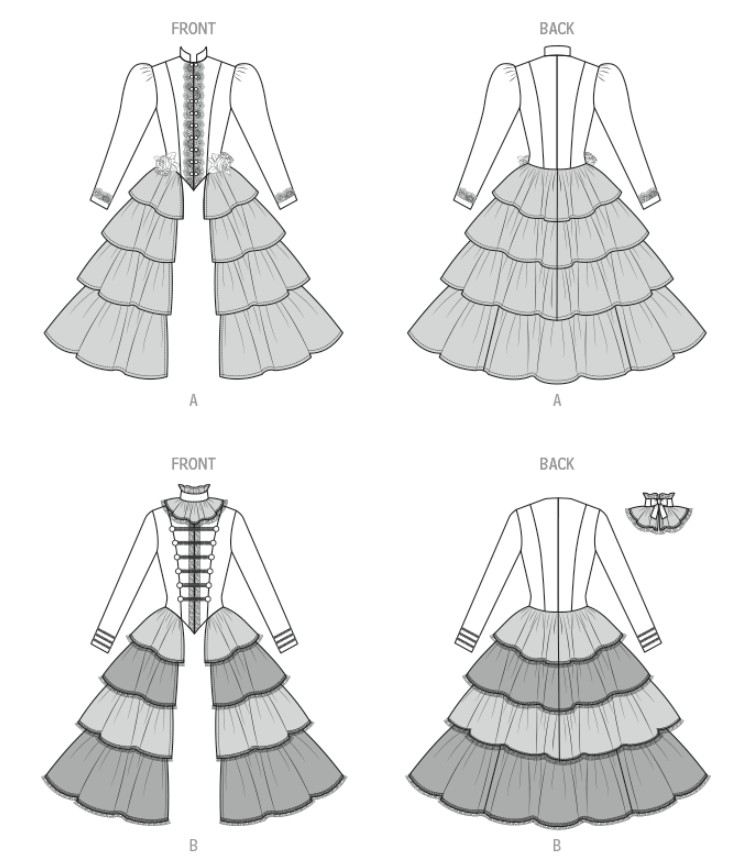 Lined costume coats with front hook and eye closure have fitted princess seamed basque bodices, long sleeves, jewel necks and a-line skirt base for contrast ruffles. Victorian-themed coat has stand collar, lace-trimmed puffed sleeves, front lace and button trim, contrast ruffles and purchased flower pin accents. Carnival-themed coat has straight sleeves with braid trim, front braid and button closures, ruffles cut from alternating contrast fabrics and detachable ruffled collar. Bodice front, ruffles and collar ruffles are all trimmed with wide lace. See envelope for more information.