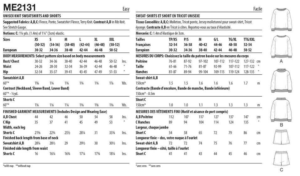 Fabric Suggestions: A,B,C: Fleece, Ponte, Sweatshirt Fleece, Terry Knit. Contrast A,B in Rib Knit. See Stretch Gauge.