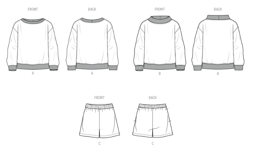 Oversized sweatshirt patterns have dropped shoulders, mock neck or crewneck option and contrast rib knit at neckline, cuffs and hem. Pull-on short patterns have elastic waistband and side seam pockets.