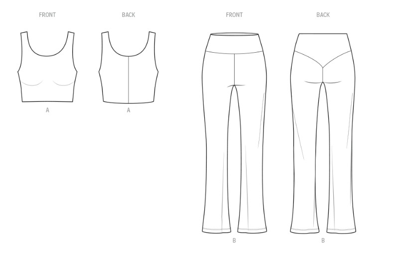 Sleeveless sports top pattern is cropped and has scoop neckline. High waist leggings have wide waistband and flare hem.