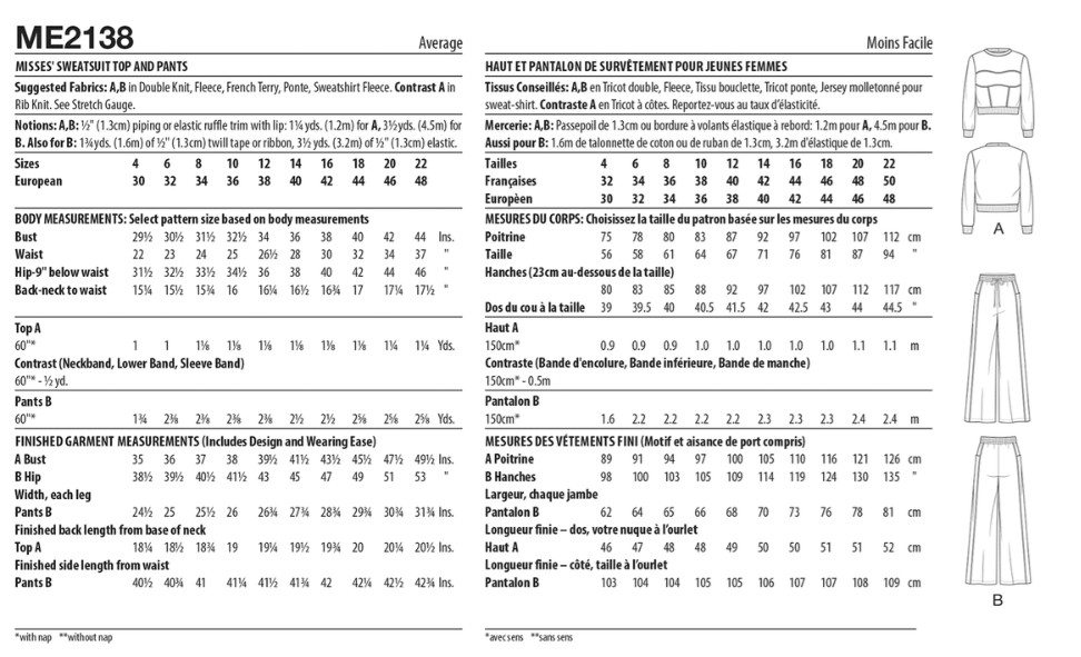 Fabric Suggestions: A,B in Double Knit, Fleece, French Terry, Ponte, Sweatshirt Fleece. Contrast A in Rib Knit. See Stretch Gauge.