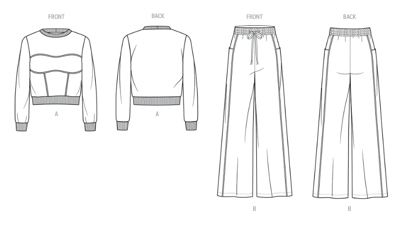 Sweatsuit top sewing pattern designed in a corseted silhouette has long sleeves, rib knit neckline, hem and cuffs. Wide leg knit pants have elastic waistband with drawstring, and side pockets. Top and pants have purchased piping or trim.