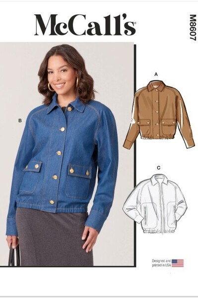 Unlined blouson jacket patterns have pointed collar, elastic hem, patch pockets and button cuffs. Views A and B have front button opening. View C has separating front zipper.